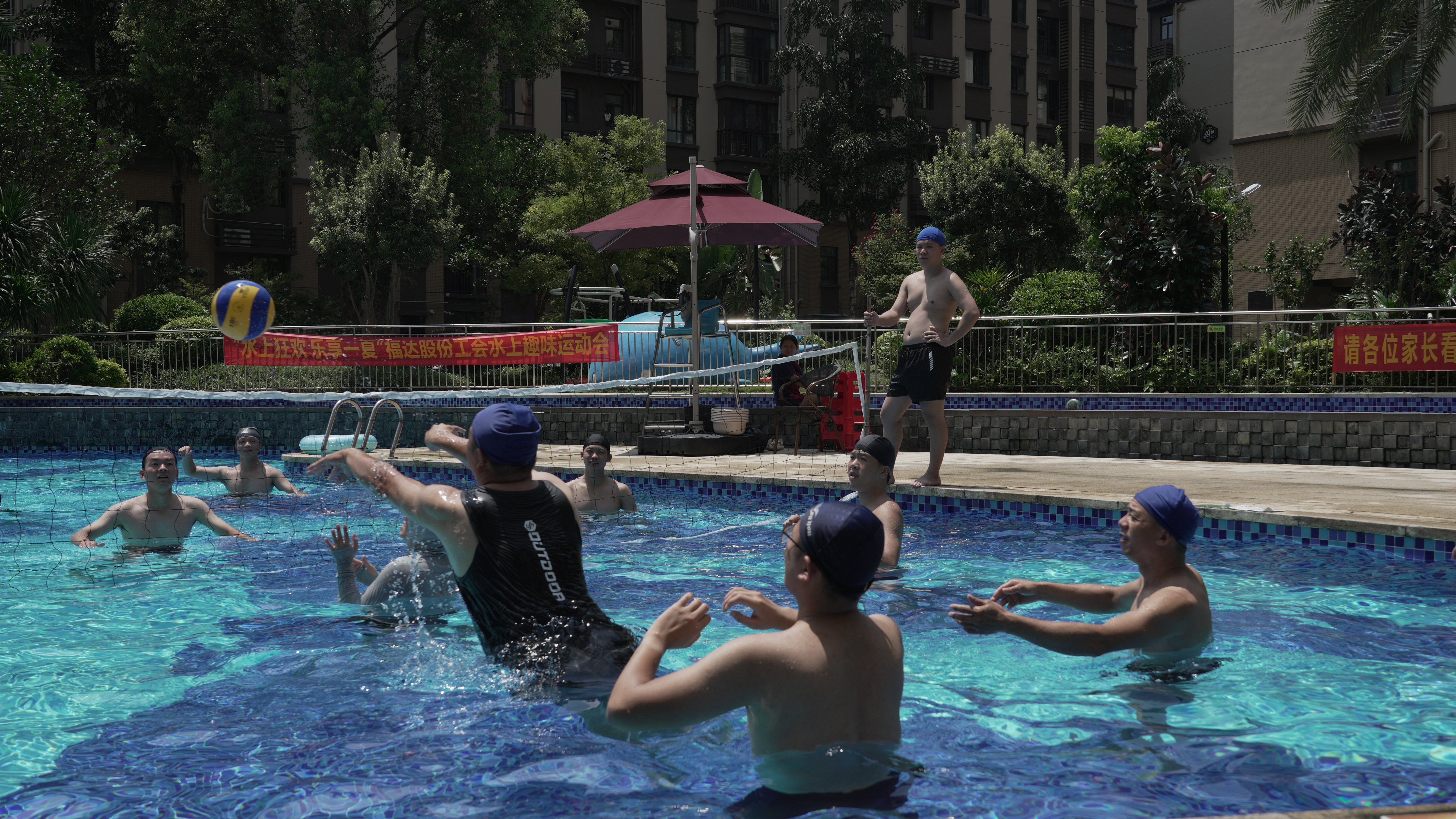 參賽隊伍在水上展開氣排球循環(huán)對抗。發(fā)球、傳球、扣殺……水花與排球齊飛,戰(zhàn)術與激情共舞,每一分都扣人心弦。